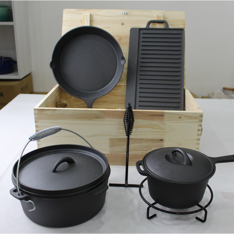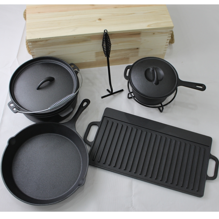 Comprehensive 7-Piece System: Includes 1 Dutch Oven (with lid), 1 Skillet, 1 Saucepan (with lid), 1 Reversible Griddle (flat/ridged), 1 Iron Trivet, and 1 Lid Lifter. Covers 100% of outdoor cooking needs. (包含荷兰锅、煎锅、酱汁锅、双面烤盘、底座及提盖器,100%覆盖户外烹饪需求。)